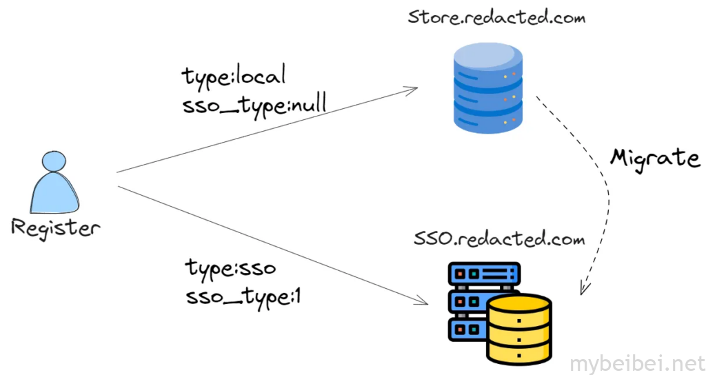 有 2 个不同的数据库,我们称之为 Store 和 SSO,普通用户只能在SSO数据库中注册,只有获得授权的个人(特殊角色)才能在商店中创建帐户,并且“迁移”功能会将该普通用户的电子邮件迁移到 SSO。但是这两个数据库不同步。
