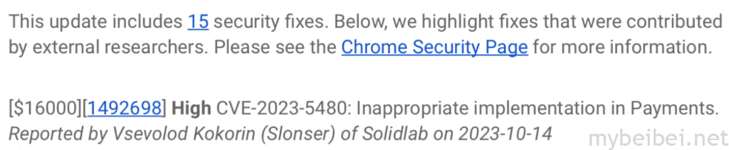 - 2023年10 月 26 日,Google 将这一发现估价为 16,000 美元(15,000 美元用于漏洞本身,1,000 美元用于识别出现漏洞的版本)