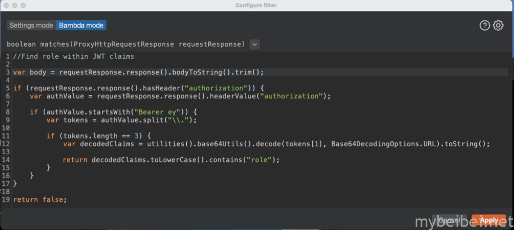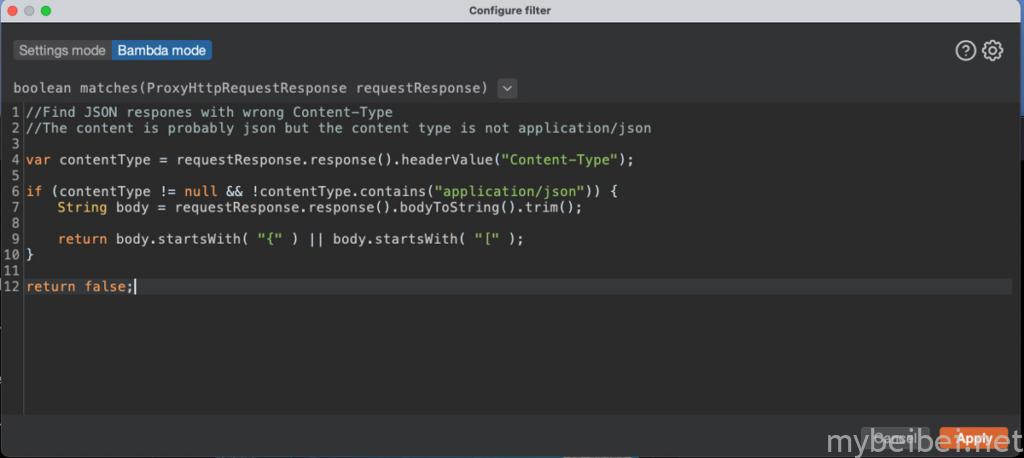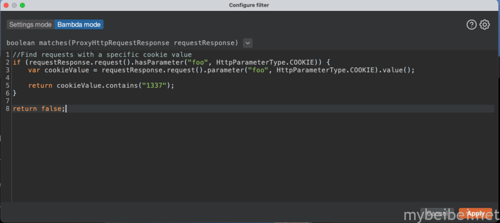 Bambda 能够为代理 HTTP 历史记录编写自定义过滤器(其实以前我们也可以通过正则表达式来自定义过滤结果),但现在官方推出了Bambda这个功能,可以利用Java代码编写自定义过滤器来过滤出你想要的结果。