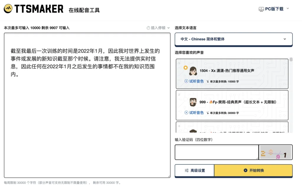 TTSMaker是一个免费在线的文本转语音平台和AI配音神器,可以通过AI人工智能算法轻松将文本转换成音频,支持在线播放或者下载音频文件。它还支持多种语言,多达50多种语言,以及超过300种语音风格。