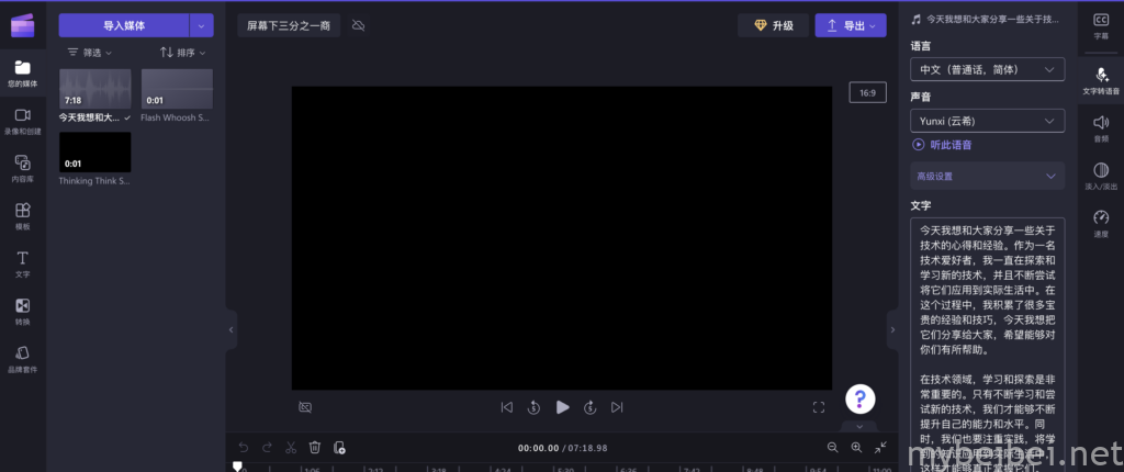 Clipchamp是由微软收购的一款视频剪辑工具,目前可免费使用,工具小巧便捷,最主要的是可以免费白嫖微软的AI文字转语音的配音功能,喜欢微软AI声音的,可以果断用起来了~