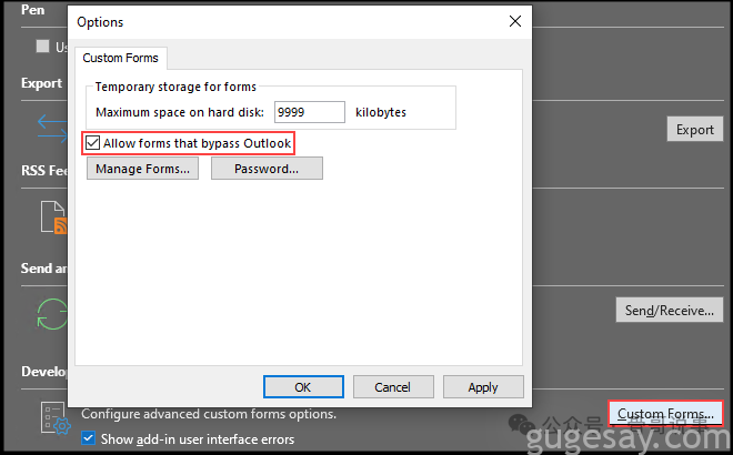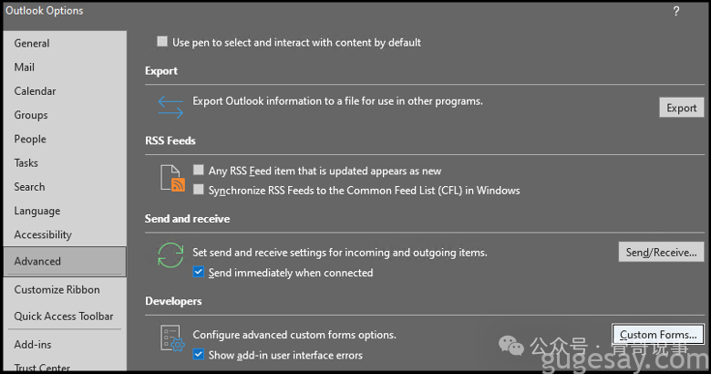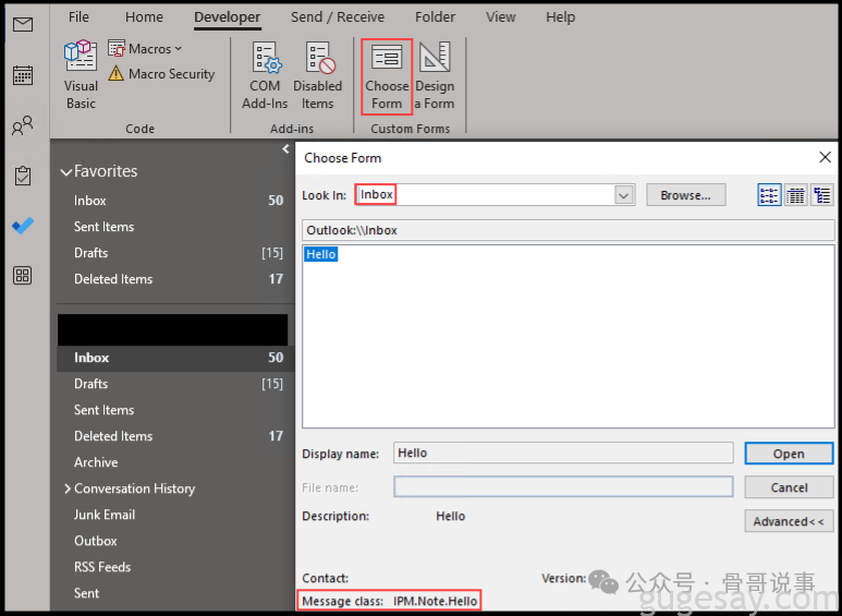 然后,可以使用配置文件在 Outlook 中安装表单,方法是导航到文件 -> 选项 -> 高级 -> 自定义表单并选择 hello.cfg 文件。