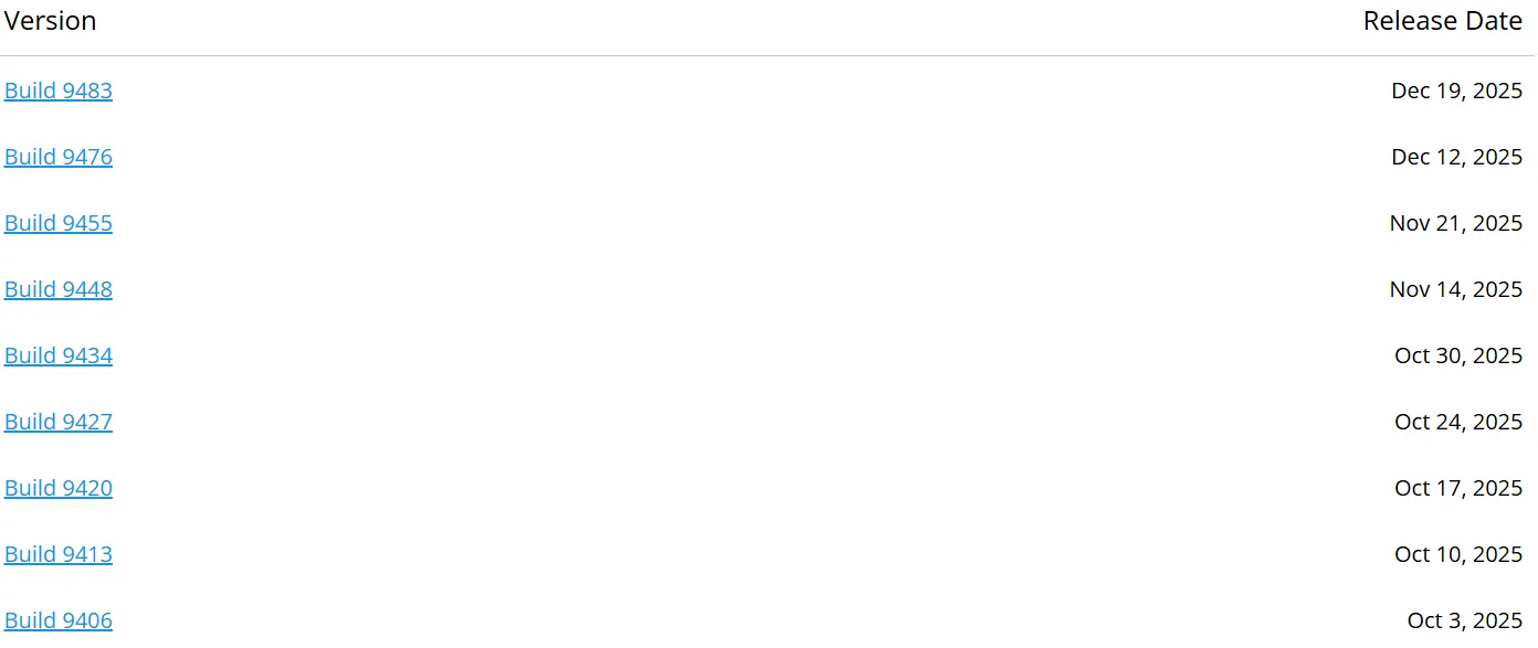 CSA的漏洞公告和CVE条目都在2025年12月底发布。然而,通知中声称该漏洞已在 build 9413 中修复。但问题来了:build 9413 的发布日期是2025年10月10日。在研究团队撰写此报告时,最新版本已经是 build 9483 了。