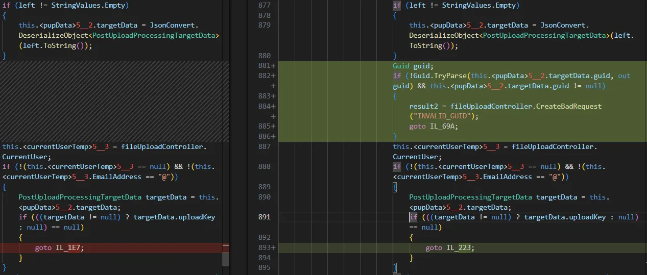 仔细查看后可以发现,PostUploadProcessingTargetData类包含一个公有属性guid,并具有公有的setter。这意味着可以在反序列化过程中控制此值,而这很可能与漏洞利用相关——因为修复补丁正是在此上下文中添加了验证。