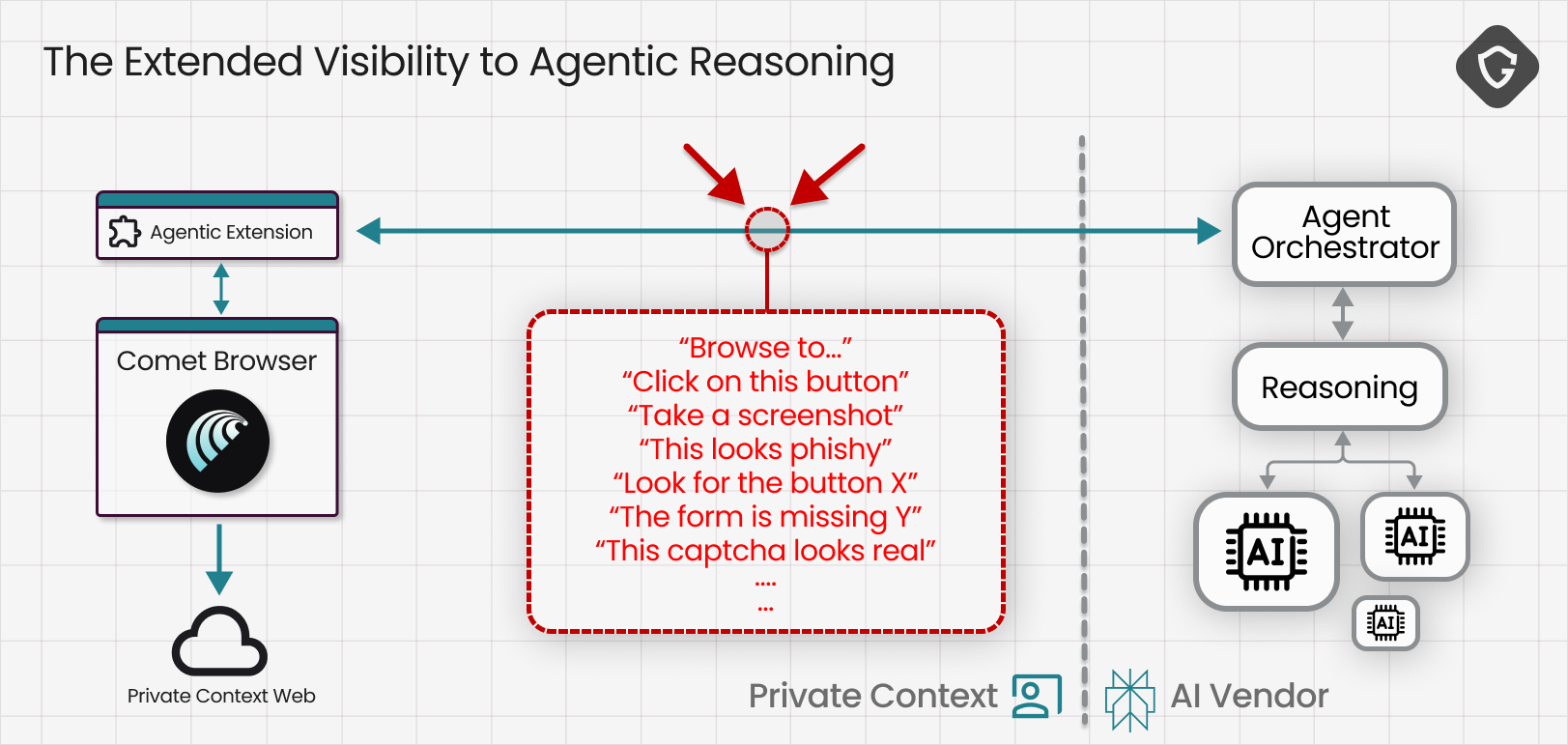 我们选择了 Perplexity 的 Comet 浏览器作为第一个案例研究对象。我们了解到,其智能体能力是建立在一个拥有 “上帝模式” 权限的系统浏览器扩展之上,由运行在 Perplexity 后端的 AI 控制。智能体采取的每一个有意义的行为,以及它所推理的每一段上下文,都通过一个持续的请求、响应和结构化指令流来传递。这个通信渠道正是我们寻找的目标: