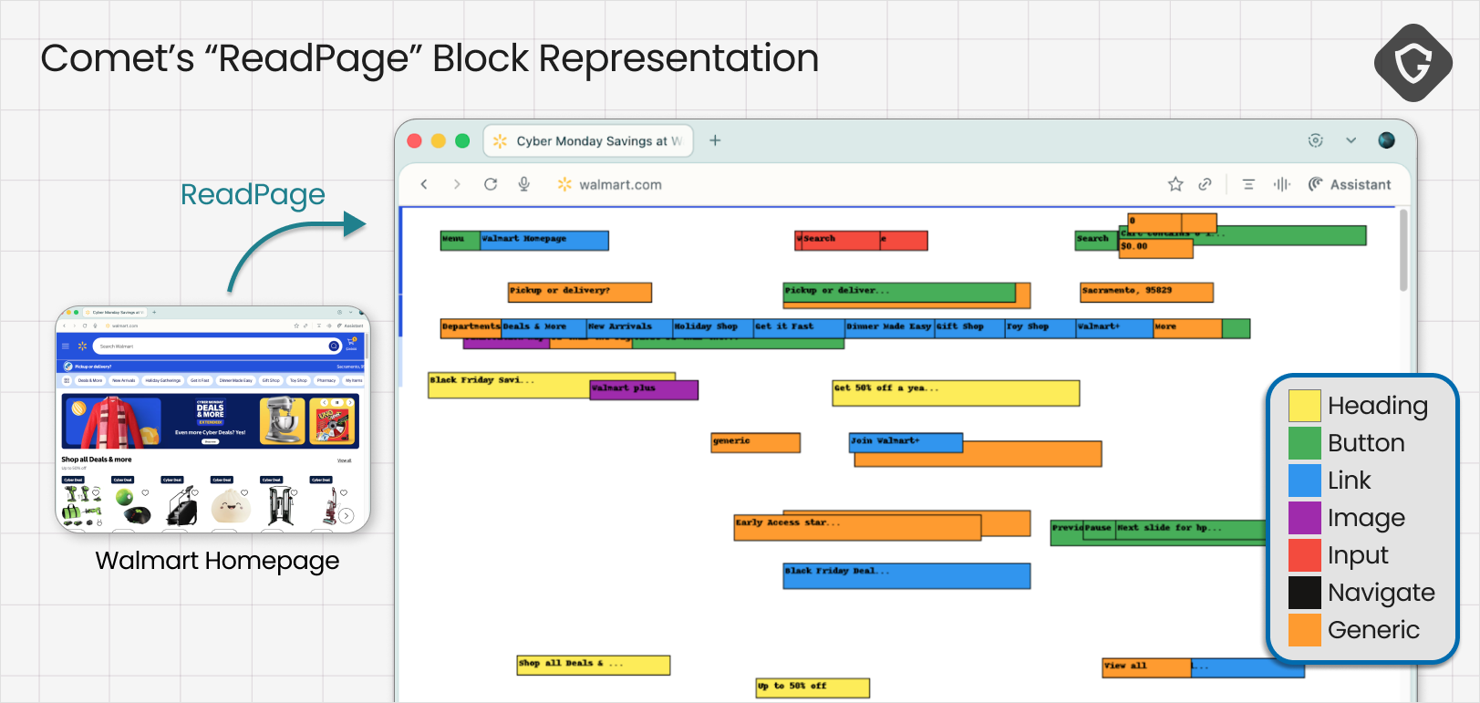 Comet 再次以截图开始,但这一次,首次接着执行了 “ReadPage”。换句话说,我们通过了视觉检查这一关,智能体进入了更深层的DOM检查。