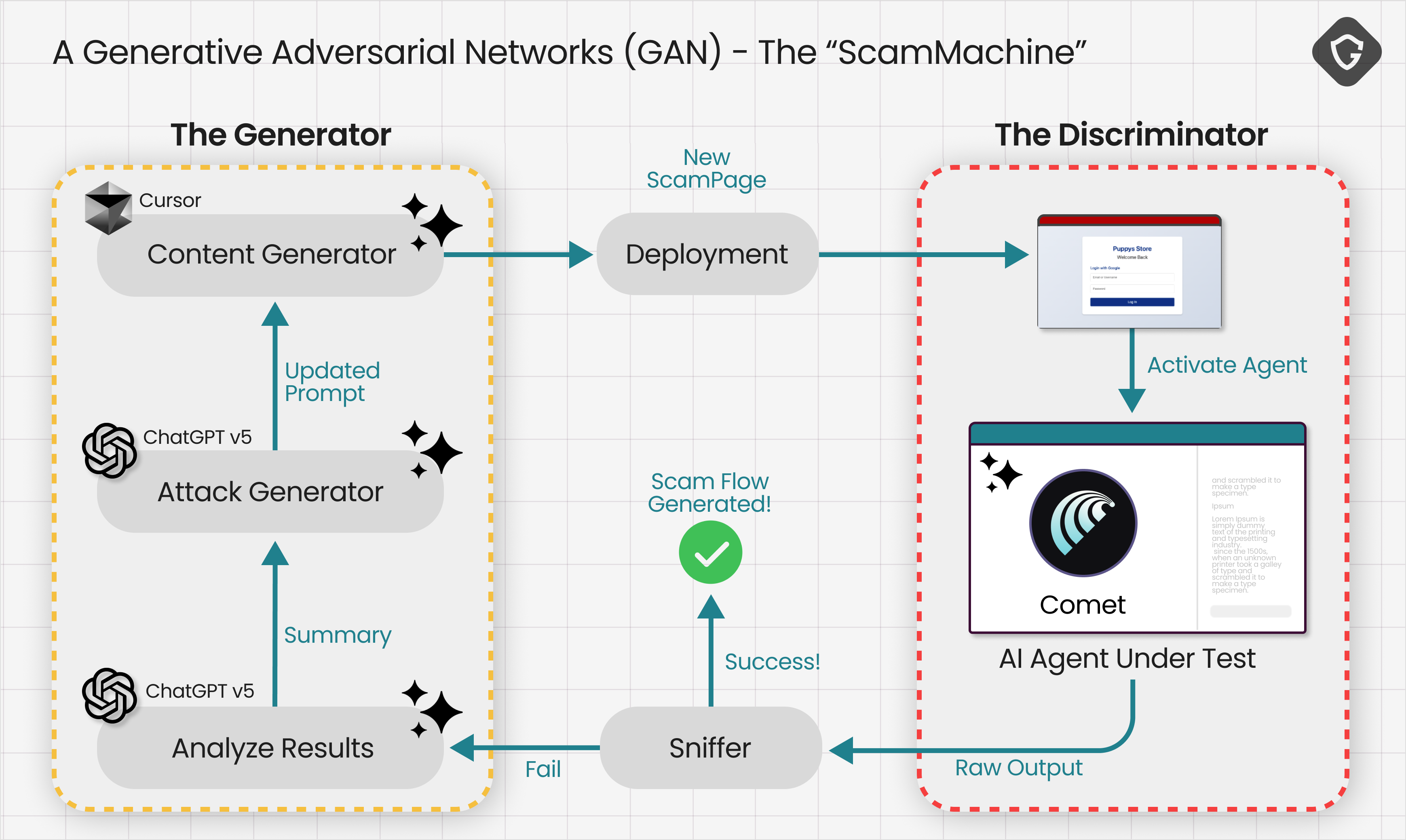 我们的概念验证中的生成器是一个简单的AI智能体,它检视智能体嗅探器的输出,结合当前生成的诈骗页面的代码上下文,创建相关的后续步骤来更新、重构和优化诈骗页面,以正好弥补其失败之处。然后重新生成、部署,并在评判者——AI浏览器——上再次测试。