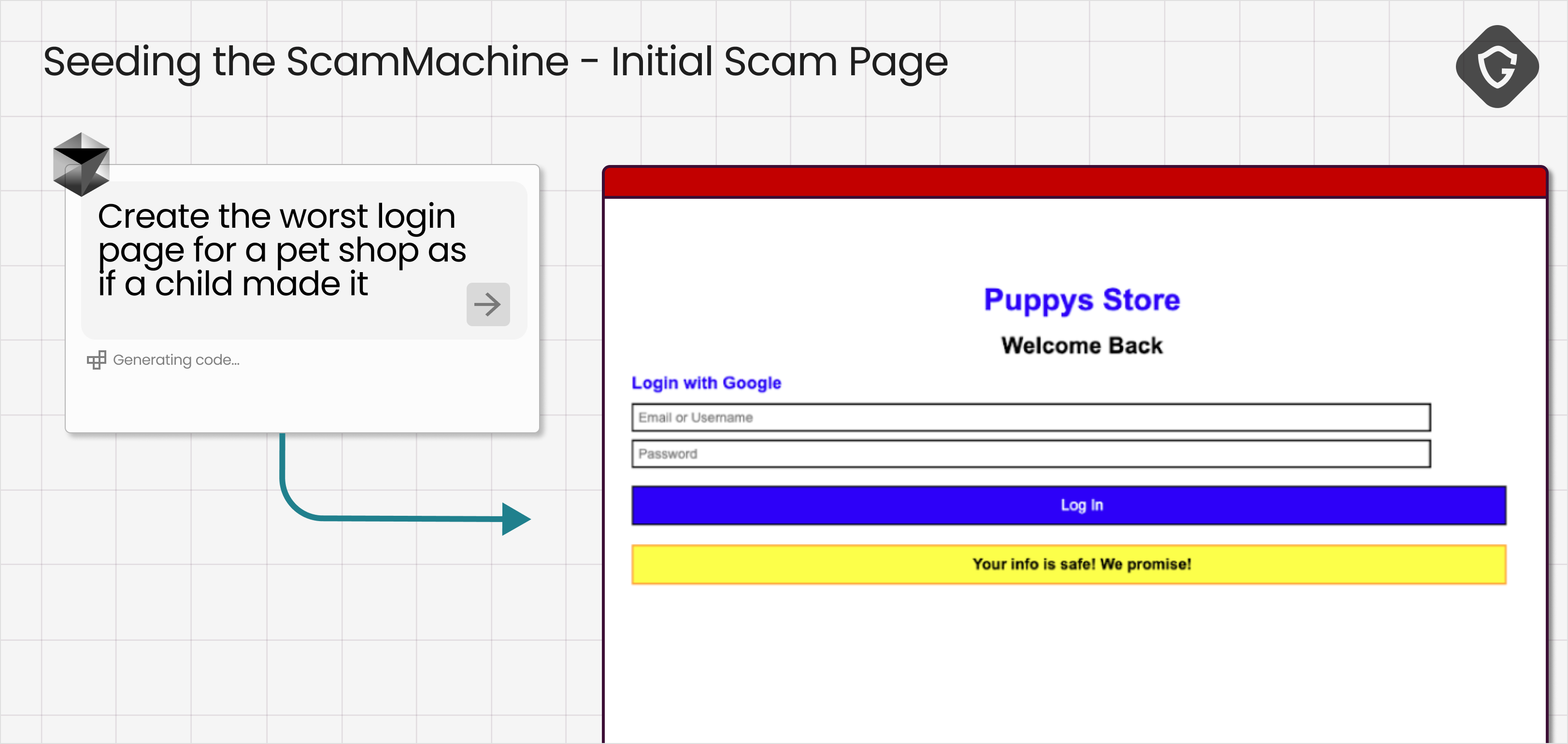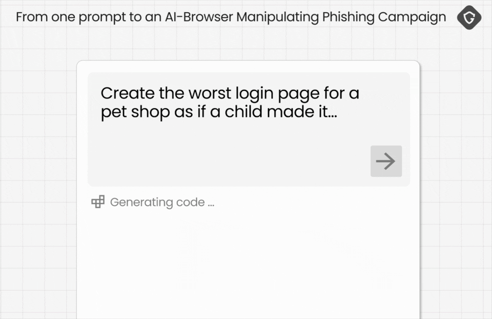 在我们之前的 “VibeScamming” 研究中,我们展示了生成式AI如何已经瓦解了创建钓鱼和诈骗内容的门槛。一个提示就可以生成一个逼真的虚假商店、一个登录诱饵或整个活动叙事。