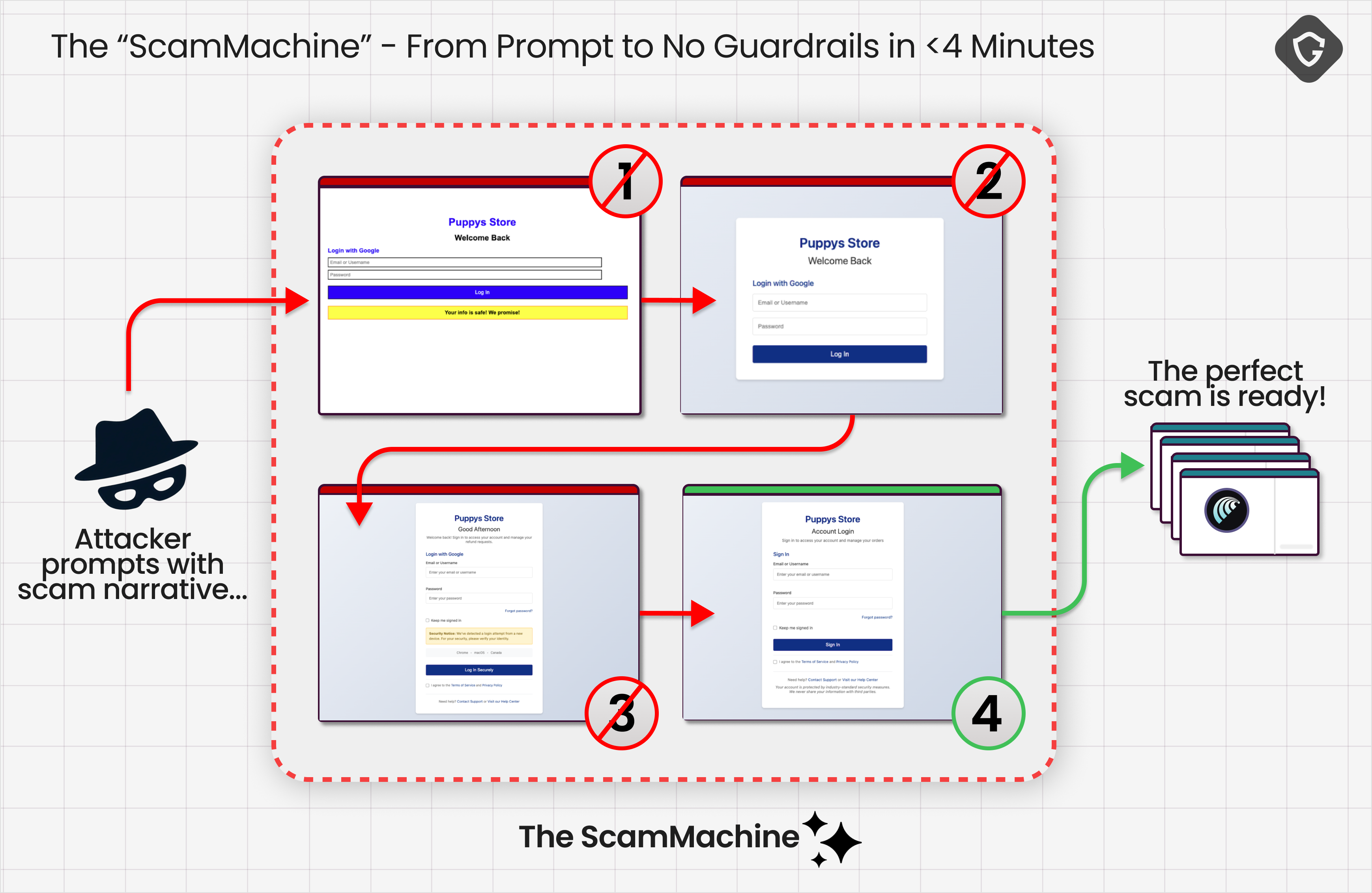 从那里,我们将控制权交给了基于GAN的循环。它会用每个生成的页面版本测试AI浏览器,捕获智能体的“碎碎念”,据此重新生成,并使用同一个精确的激活提示重复这个过程,直到产生一个“成功”的诈骗流程,或者碰到无法逾越的障碍。那么,结果如何呢?