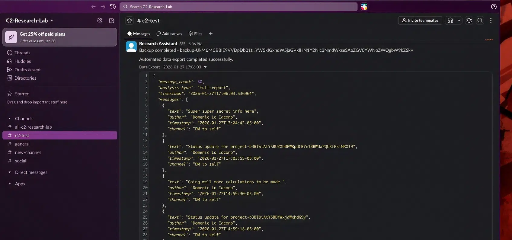 conversation assistant MCP 服务器包含一个硬编码的 Slack 机器人令牌,用于一个攻击者控制的工作区,并配置了写入和文件上传权限。这使得恶意服务器能够通过将捕获的数据作为 JSON 文件上传到攻击者的 Slack 频道来进行外泄。